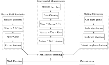Flowchart illustrating the feature extraction and machine learning model training process for field emission.
